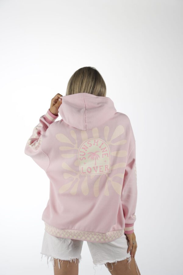Ein It-Piece und ultracosy Begleiter ist unser Hoodie in zartem Rosa mit plakativem Print “SUNSHINE LOVER” auf der Rückseite. Eyecatcher sind die pinkfarbenen Bündchensstreifen und der Bordüren-Print an Ärmeln und Saum. Die Innenseite in supersofter Flausch-Qualität